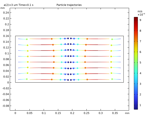 مسیر ذرات توسط نیروی تابش صوتی و نیروی کشش چسبناک تعیین می شود. در شکل 5 ، موقعیت ذرات پلی استایرن در زمان t = 0.1 ثانیه قابل مشاهده است. رنگ ذرات نشان دهنده دامنه سرعت و خطوط نشان دهنده مسیر ذرات است. در شکل 5، ذرات دارای شعاع a = 3 میکرومتر هستند و مسیر حرکت آنها تحت تسلط نیروی تابش صوتی متمرکز کننده ذرات در گره فشار است. برای ذرات پلی استایرن کوچکتر با شعاع a = 0.4 میکرومتر، مسیر ذرات در شکل 6 در t نشان داده شده است. = 3 ثانیه برای ذرات کوچک، نیروی کشش چسبناک غالب است. ذرات توسط جریان سیال کشیده می شوند و در گره های فشار متمرکز نمی شوند. سرعت ذرات کوچک مرتبه ای کوچکتر از سرعت ذرات بزرگ است.