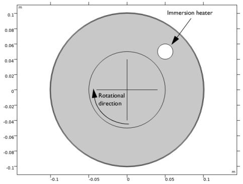 هندسه مدل در شکل 1 نشان داده شده است . نمای مقطعی از میکسر آزمایشگاهی رومیزی را نشان می دهد. همزن های کوچک همیشه گیج نمی شوند. در عوض، یک یا چند میله از درب مخلوط کن وارد می شود و به عنوان بافل عمل می کند. میله ها معمولاً حاوی تجهیزاتی برای اندازه گیری، به عنوان مثال، دما یا سطح pH هستند. در این مدل، میکسر توسط یک بخاری غوطه وری ساده که دمای سطح ثابت آن 60 درجه سانتی گراد است، گیج می شود.