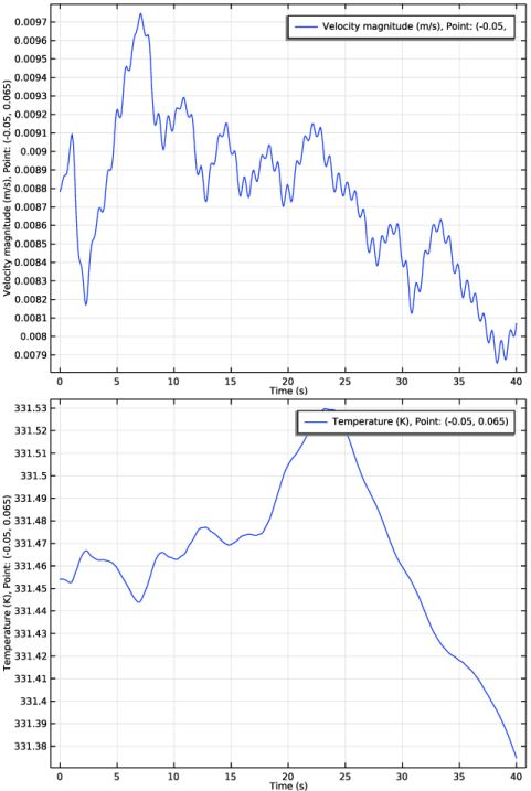 برای نظارت بر پیشرفت به سمت حالت پایدار، قدر سرعت و دما a ( x , y ) = ( -0.05 , 0.065 ) کاوش می شوند . مکان در شکل 3 نشان داده شده است . همانطور که مشاهده می شود، درست خارج از منطقه چرخش در امتداد دیوار بالایی قرار دارد.