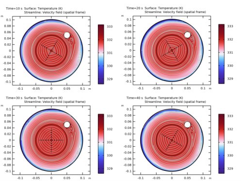 با نگاهی به شکل 3 ، می توان دید که ناحیه چرخش در امتداد دیواره بالایی شامل یک گرداب بزرگ و منفرد است. همانطور که شبیه سازی پیشرفت می کند (از t  =  20 تا t  =  40 s)، اندازه و قدرت گرداب ها در نتیجه برهم کنش بین اختلال ایجاد شده توسط گرم کننده غوطه وری و دیواره خارجی تغییر می کند.
