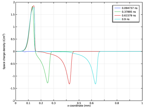 در سمت چپ نیز یک منطقه جداسازی شارژ وجود دارد. این ناحیه به این دلیل ایجاد می شود که الکترون ها به سمت آند کشیده می شوند و یون های ایجاد شده را پشت سر می گذارند. یونها، که بسیار کمتر از الکترونها تحرک دارند، در این شبیهسازی 0.9 ns زمان رانش را ندارند. همچنین توجه داشته باشید که این ناحیه جداسازی بار در زمان حرکت نمی کند، که با تنظیم سطوح پایین پیش یونیزاسیون به دست می آید.