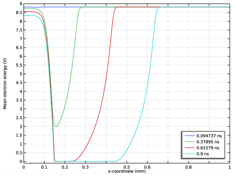 شکل 4: میانگین انرژی الکترون برای چهار لحظه زمانی در طول انتشار جریان.