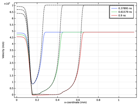 شکل 5: سرعت رانش الکترون (خطوط جامد رنگی) و سرعت محاسبه شده با استفاده از معادله 11 (خطوط چین دار سیاه) برای سه لحظه در طول انتشار استریمر.