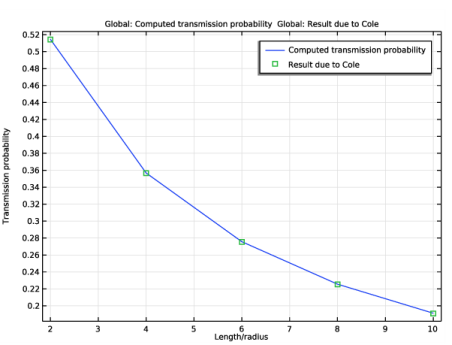 این مدل از COMSOL Multiphysics برای محاسبه احتمال انتقال برای جریان مولکولی مولکول ها از طریق یک میکروکاپیلاری با نسبت های مختلف طول به شعاع استفاده می کند. نتایج با راه حل دقیق کول مقایسه می شوند ( مرجع 2 ).