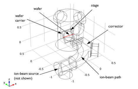 این مثال طراحی یک سیستم کاشت یون را در نظر می گیرد. کاشت یون به طور گسترده در صنعت نیمه هادی برای کاشت مواد ناخالص در ویفرها استفاده می شود. در داخل یک کاشت یون، یون های تولید شده در یک منبع یونی توسط یک میدان الکتریکی برای رسیدن به انرژی ایمپلنت مورد نظر شتاب می گیرند. یونهای دارای حالت بار صحیح با استفاده از یک آهنربای جداکننده انتخاب میشوند که پرتو یونی را خم میکند تا اطمینان حاصل شود که یونهایی با نسبت بار خاص به جرم تنها یونهایی هستند که به ویفر میرسند. دوز انرژی و زاویه پرتو یونی هر دو پارامتر کلیدی برای فرآیند هستند. این قسمت از سیستم به عنوان اصلاح کننده شناخته می شود.