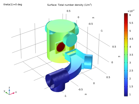 راه اندازی این مدل با استفاده از رابط جریان مولکولی ساده است. شرایط مرزی پمپ خلاء برای پمپ ها و شرایط مرزی دیواره خروجی برای سطح ویفر استفاده می شود. هندسه سیستم خلاء وارد شده است، اما ویفر و حامل آن در COMSOL Multiphysics تولید میشوند تا زاویه خط پرتو را بتوان به راحتی پارامتر کرد.