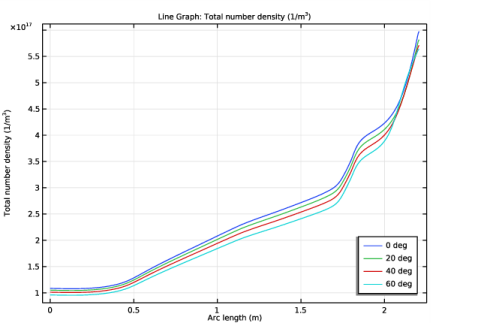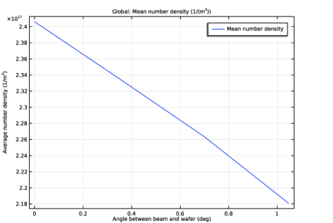 اثر سایه انداز تکیه گاه ویفر در هر دو زاویه ویفر نشان داده شده در شکل 2 مشهود است . همچنین واضح است که شار بیشتری وارد خط پرتو می شود که ویفر معمولی موازی با پرتو باشد زیرا خط دید با خط پرتو موازی با ویفر معمولی است. چگالی عدد در طول مسیر پرتو در شکل 3 نشان داده شده استبرای هر یک از زوایای حل شده برای. چگالی عدد در طول مسیر پرتو به سمت ویفر با تغییرات شدید در گرادیان با عبور پرتو از روزنههای مختلف افزایش مییابد. توجه داشته باشید که در مجاورت ویفر چگالی عددی به طور دقیق محاسبه نمی شود (این را از نمودار زیر به سختی می توان دید، اما بزرگنمایی در نمودار در انتهای پرتو مشکلاتی را در نتایج برای عناصر مجاور سطح نشان می دهد) . این نتیجه مسائل عددی هنگام محاسبه چگالی اعداد بسیار نزدیک به سطح منبع در دامنه است.