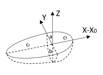 نقطه مرکزی قوس جوش در امتداد محور X با سرعت vel  = 1 میلی متر بر ثانیه حرکت می کند. بنابراین موقعیت فعلی آن با 0 = vel ·t داده می شود. منبع گرما توسط Goldak توسط دو ناحیه تعریف می شود که در 0 به هم می پیوندند و شکل آنها بیضی است. عرض a و عمق b این نواحی برابر است، اما طول جلو و عقب، cf و r ، ممکن است متفاوت باشد، به شکل 4 مراجعه کنید . منبع گرما توسط: