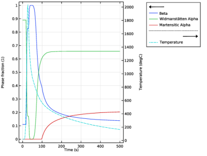 همانطور که قوس جوش در امتداد صفحه حرکت می کند، ماده را گرم می کند. در واقعیت، یک حوضچه مذاب تشکیل می شود، اما این در اینجا مدل سازی نشده است. درعوض، ما به تغییر فازهای حالت جامد که از گرم کردن مواد و متعاقباً سرد شدن مواد ناشی می‌شوند، توجه داریم. شکل 5تکامل ترکیب فاز را در طول زمان، در نیمه راه در طول مسیر جوش نشان می دهد. ترکیب اولیه 89٪ فاز آلفا Widmanstätten و 11٪ فاز بتا است. با افزایش دما از ترانسوس بتا، فاز آلفا به فاز بتا حل می شود. با عبور قوس جوش، ماده در زیر ترانوس بتا سرد می‌شود و فاز بتا به Widmanstätten آلفا تبدیل می‌شود. با سرد شدن بیشتر در زیر دمای شروع مارتنزیت، فاز آلفای مارتنزیتی تشکیل می شود. این مثال شامل یک پاس جوش است. در شرایط چند پاس جوش، ترکیب فاز با هر پاس جوش تغییر می کند. با انجام شبیه‌سازی‌های به اصطلاح جوشکاری چند پاسی، می‌توان بینشی در مورد چگونگی توسعه مواد در منطقه تحت تأثیر حرارت (HAZ) به دست آورد.