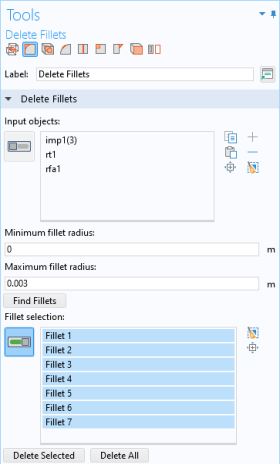 در پنجره Tools همه اشیا از قبل در لیست اشیاء ورودی ظاهر می شوند و می توانید 0.003 را در قسمت متنی Maximum fillet radius وارد کنید.