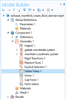 با تکمیل عملیات و حذف فیله‌ها، توجه داشته باشید که گره Delete Fillets 1 (dfi1) به دنباله هندسی، درست بالای گره Union 1 (uni1) وارد شده است. گره Union 1 (uni1) هنوز در دسترس نیست، به این معنی که در حال حاضر ساخته نشده است.