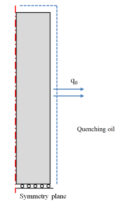شمش فولادی استوانه ای جامد به طول 20 سانتی متر و شعاع 2 سانتی متر است. شمش در روغن، به طور یکنواخت در سراسر مرز خود، از طریق یک ضریب انتقال حرارت وابسته به دما، خاموش می شود. به دلیل تقارن ها، در تقارن محوری دوبعدی فقط نیمی از بیلت در نظر گرفته می شود. بیلت در شکل 1 نشان داده شده است . شرایط مرزی حرارتی و مکانیکی در زیر مورد بحث قرار گرفته است.