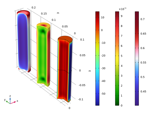 در طول خنک شدن، مواد موجود در بیلت تحت فشار قرار می گیرند. کرنش های حرارتی از تغییر دما ناشی می شوند و تنش های مکانیکی باعث شکل پذیری ناشی از تبدیل (TRIP) می شود. تنش ها از تنش تسلیم اولیه ماده مرکب بیشتر است. این را می توان در شکل 2 (وسط) مشاهده کرد، جایی که بزرگترین کرنش پلاستیکی معادل روی سطح بیلت مشاهده می شود. شبیه سازی خاموش کردن تنش های پسماند را محاسبه می کند. در شکل 2 (سمت راست)، تنش محوری نشان داده شده است. توجه داشته باشید که تنش ها روی سطح بیلت فشاری هستند. این معمولا از نقطه نظر خستگی مفید است.