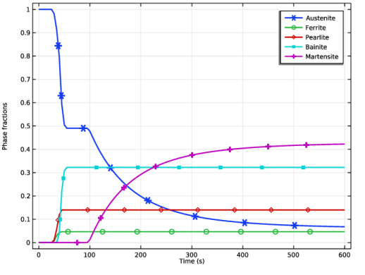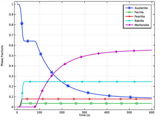 ترکیب فاز در حال تکامل برای دو مکان در صفحه میانی بیلت نشان داده شده است: شکل 3 ترکیب فاز را روی سطح نشان می دهد و شکل 4ترکیب فاز در مرکز بیلت با مقایسه این ترکیبات فازی، کسر نهایی مارتنزیت در سطح بالاتر از مرکز بیلت است. در سطح، نرخ خنکسازی توسط ضریب انتقال حرارت و اختلاف دما بین سطح و روغن خاموش کننده کنترل میشود. اگر روغن قادر به ارائه سرعت خنکسازی به اندازه کافی باشد، تبدیلهای فاز کنترلشده با انتشار به نفع تبدیل مارتنزیتی جابجایی محدود میشوند. در مقابل، سرعت سرد شدن یک نقطه ماده در مرکز شمش توسط انتشار حرارتی مواد محدود میشود. معمول است که عناصر آلیاژی خاصی را به مواد اضافه می کنند تا ویژگی های تبدیل فاز را تغییر دهند. به این ترتیب برخی از تبدیلات فاز کنترل شده با انتشار می توانند کاهش یا حتی سرکوب شوند.