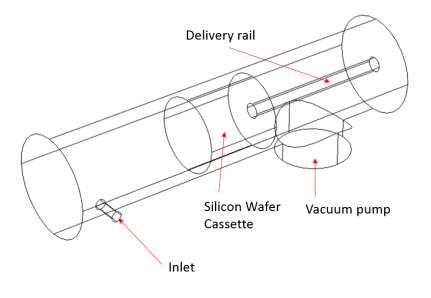 هندسه شامل یک محفظه استوانه ای با ورودی و پمپ خلاء در دو انتها است. یک کاست از ویفرهای سیلیکونی توسط یک استوانه با قطر باریکتر در انتهای یک ریل تحویل تقریب می شود.