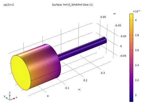 گاز واکنش دهنده، سیلان (SiH 4) همراه با گاز رقیق کننده، هیدروژن (H2 ) از طریق ورودی وارد می شود. کل نرخ جریان جرمی گاز 1 SCCM (0.2 SCCM SiH 4 ، 0.8 SCCM H 2 ) است. شرایط مرزی دیوار خروجی برای این ورودی استفاده می شود.