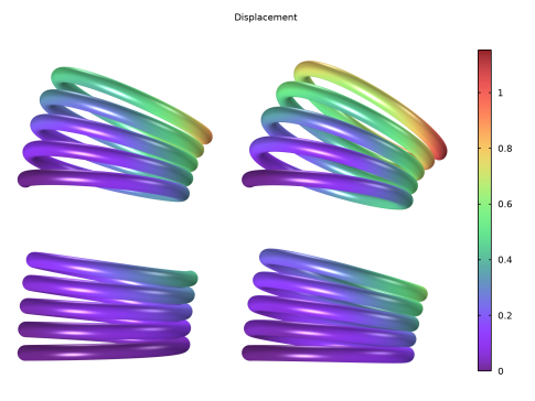 شکل 2 شکل تغییر شکل فنر را در جابجایی های عمودی مختلف نشان می دهد. به وضوح می توان دید که سیم پیچ فنر چگونه خود تلاقی می کند و این تماس از هر گونه همپوشانی جلوگیری می کند. علاوه بر این، با افزایش جابجایی، فنر به دور نقاط تماس بچرخد. جابجایی عمودی که در آن سیم پیچ به خود قطع می کند نیز در شکل 3 به وضوح قابل مشاهده است که نیروی اعمال شده به فنر را نشان می دهد. به طور تقریبی −4.5 سانتی متر، تغییر واضحی در منحنی است که نشان دهنده برقراری تماس است. پس از این نقطه، می توان مشاهده کرد که پاسخ نیرو در مقابل جابجایی غیرخطی می شود، اثر لغزش بین مرزهای تماس. اگر جابه‌جایی بیش از 10 سانتی‌متر افزایش یابد، با غلبه بر مقاومت اصطکاک، تماس در نهایت از بین می‌رود و باعث غیرخطی بودن حتی بیشتر در پاسخ می‌شود.