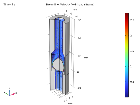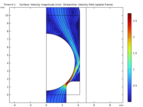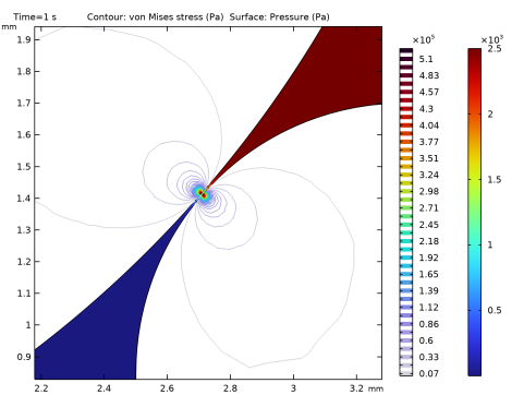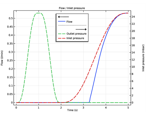تا 1 ثانیه، فشار در جهت جریان معکوس اعمال می شود. حداکثر جریان معکوس حدود 0.3 میلی لیتر در دقیقه است. این مقدار کوچک با فاصله بین قطعات در تماس توضیح داده می شود که برای جلوگیری از تغییرات توپولوژی در حوزه سیال ضروری است ( برای جزئیات بیشتر به بخش یادداشت های مربوط به پیاده سازی COMSOL مراجعه کنید). جریان معکوس را می توان با کاهش مقدار افست تماس، به قیمت زمان حل اضافی ناشی از پالایش مش، حتی بیشتر کاهش داد.