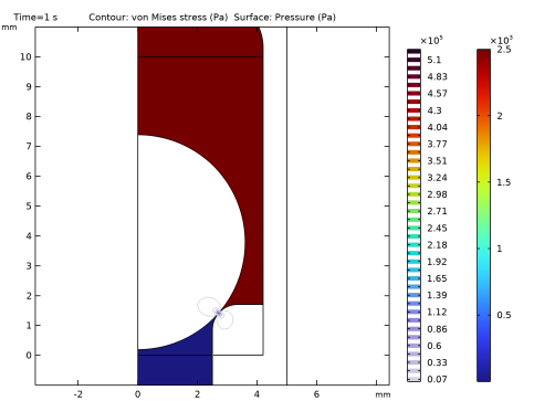 شکل 4 توزیع فشار در سیال و تنش فون میزس را در جامد در حداکثر باز شدن شیر نشان می دهد.