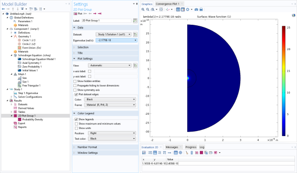 ) کلیک کنید و معادله شرودینگر> تابع موج (psi) را انتخاب کنید تا متغیر psi را رسم کنید ، که تابع موج با ارزش مختلط برای موقعیت الکترون است.در پنجره تنظیمات برای گروه طرح دوبعدی 1 ، می توانید حالت ویژه را برای رسم انتخاب کنید. در زیر داده ها ، مقدار ویژه مربوطه را از لیست مقدار ویژه انتخاب کنید . همچنین می توانید بررسی کنید که مقادیر ویژه با اولین مقادیر ویژه انرژی ذکر شده در نتایج مطابقت دارند .