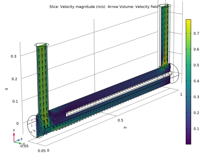 در مطالعه دوم، مشخصات سرعت جریان آب از طریق راکتور با استفاده از رابط جریان آشفته، k- ε حل شده است . راکتور در این مثال U شکل با لوله های ورودی و خروجی عمود بر جهت لامپ است.