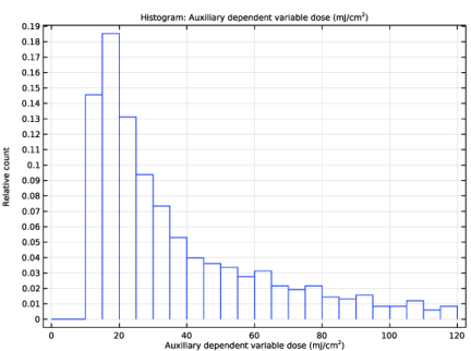 در شکل 4 نمودار هیستوگرام دوز انباشته شده ذراتی را نشان می دهد که در زمان نهایی به خروجی می رسند. همه ذرات دوز حداقل mJ/cm2 10 دریافت می کنند ، اما برای برخی از ذرات دوز انباشته شده به طور قابل ملاحظه ای بالاتر است.