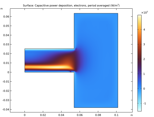 به دلیل عدم تقارن الکتریکی راکتور، الکترود کوچکتر (الکترود نیرومند در این شبیه سازی) دارای غلاف بزرگتر با میدان های الکتریکی شدیدتر است. عواقب آن دماهای الکترون بالاتر و رسوب توان در نزدیکی الکترود نیرومند است.