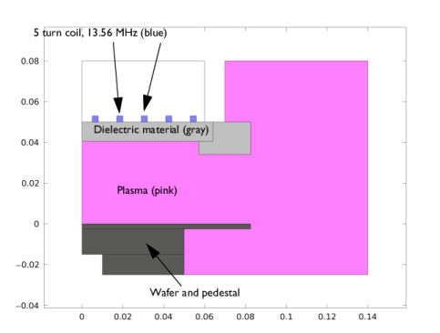 شکل 1: هندسه راکتور GEC ICP متشکل از یک سیم پیچ مسی 5 دور، حجم پلاسما، دی الکتریک و ویفر با پایه.