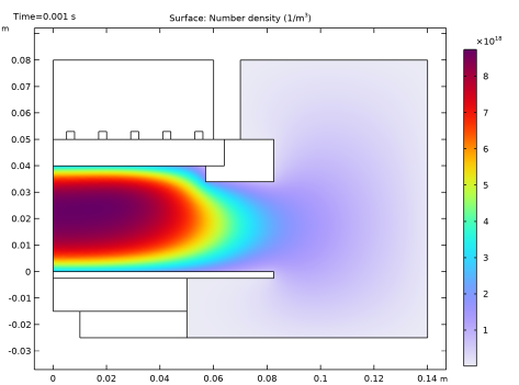 تراکم تعداد گونه های برانگیخته نیز در مرکز راکتور بیشتر است. بر خلاف گونه های باردار، هیچ افت سریعی در تراکم تعداد نزدیک به دیوارها وجود ندارد. فیزیک گونههای برانگیخته نسبتاً ساده است: آنها در مرکز راکتور توسط الکترونهای پرانرژی تشکیل میشوند و از طریق یونیزاسیون مرحلهای یا انتشار به دیواره از بین میروند. از آنجایی که اتم های آرگون برانگیخته به دلیل میدان الکتریکی مستعد مهاجرت نیستند، می توانند در مقادیر بسیار بالاتر از یون ها وجود داشته باشند. چگالی عدد اوج اتمهای آرگون برانگیخته نشاندهنده کسر جرمی حدود ۰.۰۲ است.