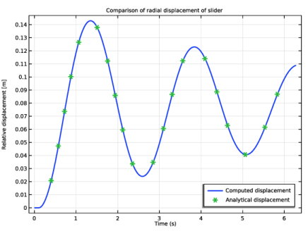 شکل 2 تاریخچه زمانی جابجایی لغزنده را در جهت شعاعی نشان می دهد. جابجایی محاسبه شده با همتای تحلیلی خود مطابقت بسیار خوبی دارد. تاریخچه زمانی جابجایی یک حرکت نوسانی لغزنده را نسبت به پایه آن نشان می دهد. اثر میرایی نیز مشهود است، زیرا دامنه نوسان در طول زمان کاهش می یابد.