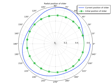 شکل 4 نمودار قطبی را برای تغییرات زمانی موقعیت شعاعی لغزنده نشان می دهد. این نشان می دهد که لغزنده هرگز در طول یک چرخش کامل پایه خود از موقعیت اولیه خود عبور نمی کند.