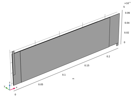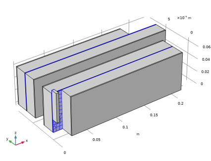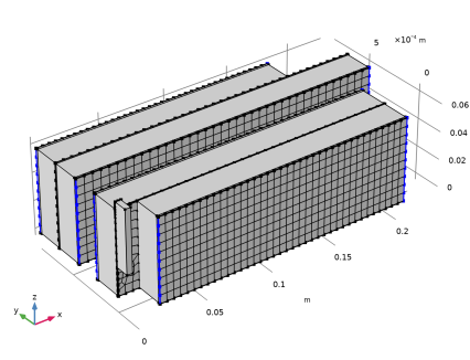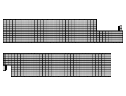 شکل 2 هندسه مدل مشبک را همانطور که از بالا مشاهده می‌کنید، نشان می‌دهد که 100 برابر در جهت صفحه عبوری مقیاس شده است. یک فاصله افست بین قسمت های منفی و مثبت برای تجسم آسان تر و مدیریت انتخاب در رابط کاربری اضافه شده است. مش در جهت صفحه جاروب می شود.