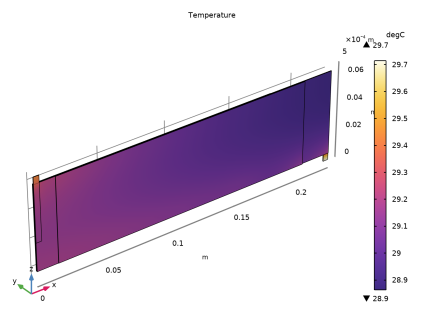 توزیع دما در رول ژله ای با استفاده از یک رابط انتقال حرارت ، با استفاده از منابع گرمای حاصل از مدل توزیع فعلی با استفاده از یک گره چندفیزیکی گرمایش الکتروشیمیایی ، مدل‌سازی می‌شود. یک شرایط مرزی خنک‌کننده همرفتی در ناحیه بیرونی رول ژله‌ای استفاده می‌شود که یک شار گرمای خنک‌کننده را متناسب با دمای سطح و دمای بیرونی (25 درجه سانتی‌گراد) تجویز می‌کند.