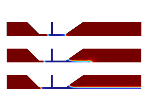 جریان در این مدل آرام است، بنابراین یک رابط جریان لایه ای همراه با یک رابط فاز فیلد برای ردیابی رابط بین هوا و سیال پلیمری استفاده می شود . جفت شدن این دو رابط توسط رابط چندفیزیکی دو فاز جریان، میدان فاز انجام می شود. شما می توانید انتخاب کنید که کدام رابطه سازنده برای هر یک از فازهای سیال استفاده شود. هوا به عنوان سیال نیوتنی مشخص می شود و سیال پوشش دهنده یک سیال قانون قدرت غیر نیوتنی است.