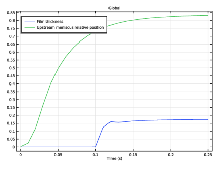 لایه پوششی به ضخامت ثابتی در پایین دست قالب در t = 0.2 ثانیه می رسد. این فیلم با دیواره های بالادست و پایین دست قالب، منیسک های بالادست و پایین دست را تشکیل می دهد. با افزایش سرعت بستر یا کاهش سرعت ورودی، منیسک بالادست به شکاف نزدیکتر میشود و در نهایت باعث ایجاد نقص در لایه پوششی میشود. تکامل ضخامت فیلم و موقعیت منیسک بالادست به عنوان تابعی از زمان در شکل 4 نشان داده شده است .