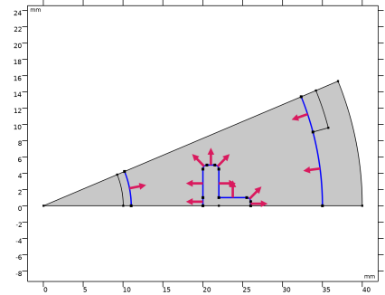 در نهایت، هندسه نشان داده شده در شکل 2 امکان استفاده از تقارن بخش و بازتاب را برای کاهش هزینه محاسباتی فراهم می کند. همانطور که در شکل 4 نشان داده شده است، هندسه را می توان به 8 بخش (که با خطوط آبی مشخص شده است) تقسیم کرد که هر بخش شامل یک صفحه بازتاب (خط قرمز) است. بنابراین دامنه محاسباتی به یک شانزدهم هندسه کاهش می یابد. سپس، برای مدلسازی تابش سطح به سطح، محاسبه ضریب دید بر روی هندسه کاهشیافته، حضور تمام سطوح هندسه کامل را در نظر میگیرد.