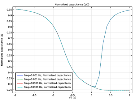 این مدل رفتار MOSCAP را تحت آرایه ای از ولتاژهای بایاس DC بین 2- و 1 ولت، به علاوه یک اغتشاش هارمونیک سیگنال کوچک 1 میلی ولت با فرکانس های 10-2 هرتز و 104 هرتز برای کم و زیاد شبیه سازی می کند. موارد فرکانس، به ترتیب. دامنه مدلسازیشده دارای ضخامت 1 0 um است. داده های مواد Si داخلی استفاده می شود.