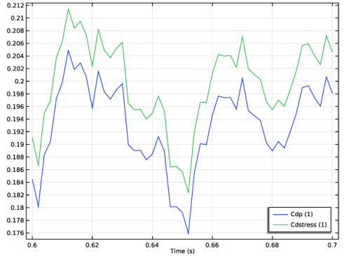 ضرایب کشیدن برای کشیدن فرم و کشیدن کل در شکل 6 به عنوان تابعی از زمان از t = 0.6 s تا t = 0.7 s نشان داده شده است. ضریب درگ (کل) حول مقدار نسبتاً پایین 0.2 در نوسان است.