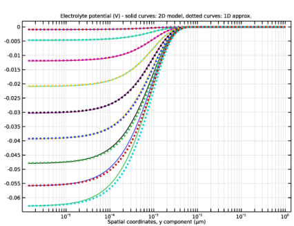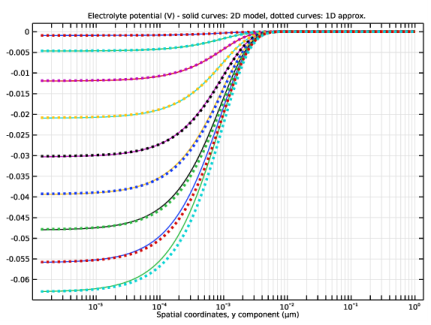 شکل 1 پتانسیل الکترولیت را در امتداد خط مرکزی حوزه الکترولیت نشان میدهد و نتیجه شبیهسازی (منحنیهای جامد) و فرمول تقریب 1 بعدی (منحنیهای نقطهدار؛ رفرنس 1 ) را مقایسه میکند. فرمول تقریب 1 بعدی با روند کلی نتیجه مدل دو بعدی مطابقت دارد.