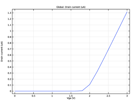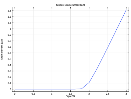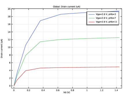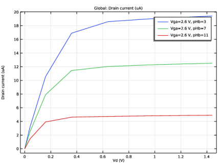 در یک دستگاه واقعی، یک مدار بازخورد ولتاژ دروازه را برای یک الکترولیت معین تنظیم می کند، به طوری که جریان تخلیه در یک نقطه تنظیم ثابت حفظ می شود. به عبارت دیگر، ولتاژ گیت اعمال شده برای جبران اثر pH استفاده می شود. بنابراین در این مورد ولتاژ گیت اعمال شده نشانگر مقدار pH می شود. شما می توانید این حالت عملکرد را با استفاده از یک معادله جهانی، بدون نیاز به مدل سازی جزئیات مدار بازخورد، شبیه سازی کنید. به طور خودسرانه نقطه عملیاتی را در ولتاژ تخلیه 1 ولت و جریان تخلیه 18 uA انتخاب کنید، که نزدیک به مقادیر داده شده توسط منحنی Id-Vd برای مقدار pH 3 است (نمودار بالا را ببینید). در مطالعه بعدی، مقدار pH را از 3 به 11 با استفاده از محلول مطالعه قبلی به عنوان شرط اولیه، جارو خواهید کرد.
