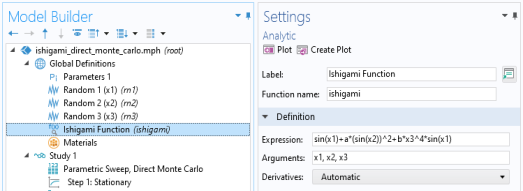 2 | در پنجره تنظیمات برای تحلیل ، ishigami را در قسمت متن نام تابع تایپ کنید . |