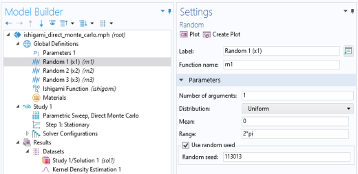 این مثال نشان می دهد که چگونه می توان یک شبیه سازی مستقیم مونت کارلو از تابع Ishigami را انجام داد. این تابع تصادفی از سه متغیر یک معیار شناخته شده است که برای آزمایش تحلیل حساسیت جهانی و الگوریتمهای کمی عدم قطعیت استفاده میشود. میانگین، انحراف استاندارد، حداکثر و حداقل مقادیر تابع Ishigami را می توان به صورت تحلیلی برای توزیع های ورودی استفاده شده در اینجا محاسبه کرد.