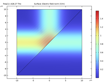 که در آن w  = 3500 نانومتر کمر پرتو و خط y  = 0 خط مرکزی پرتو است. از این عبارت در حالت مرزی پراکندگی در سمت چپ برای مدلسازی پرتو فرودی استفاده کنید. تمام مرزهای دامنه دیگر را با استفاده از شرایط مرزی Scattering مدل کنید. این شرایط زمانی مناسب هستند که در چندین طول موج دورتر از هر گونه اجسام پراکنده قرار گیرند و مشخص شود که موج در حالت عادی یا تقریباً معمولی حرکت می کند.