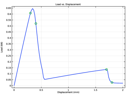 شکل 2 نیروی واکنش در کانکتور صلب بالایی را در مقابل جابجایی تعیین شده نشان می دهد. اولین قله در منحنی را می توان در بار 0.63 کیلونیوتن و جابجایی جانبی 0.33 میلی متر شناسایی کرد. همانطور که در شکل 3 نشان داده شده است ، این قله مربوط به تشکیل یک ترک در نوک شکاف است. در واقع، ترک کمی قبل از پیک مشاهده شده شروع به انتشار می کند، اولین دایره سبز رنگ را در شکل 2 و نمودار سمت چپ را در شکل 3 ببینید.. هنگامی که در رژیم پس از اوج منحنی قرار می گیرد، ترک به سرعت منتشر می شود و ظرفیت بار صفحه به طور قابل توجهی کاهش می یابد. با نزدیک شدن شکاف به سوراخ بزرگ، از مسیر مستقیم اولیه منحرف می شود. و یک پیکربندی پایدار جدید پس از رسیدن به سوراخ به دست می آید. در این مرحله می توان بار را افزایش داد، اما با سختی بسیار کمتری نسبت به قبل از تشکیل ترک.