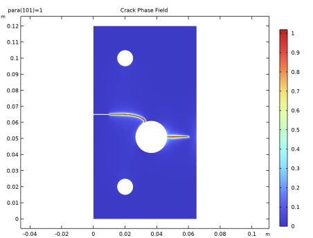 شکست با استفاده از یک مدل آسیب مدلسازی میشود که هندسه تیز ترک را با تقریب میدان فاز منظم میکند. این بدان معنی است که ترک در ماده دامنه توصیف شده است، بنابراین میدان فاز غیر محلی، مسیر ترک را مستقل از عناصر مش می کند. مثال نشان می دهد که چگونه می توان یک پیکربندی حل کننده کارآمد و پایدار برای روش آسیب میدان فاز تعریف کرد، که اغلب برای این دسته از مسائل ناپایدار است.