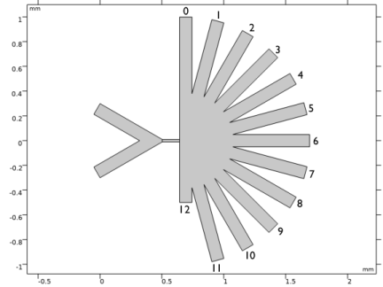 شکل 1: هندسه مدل دستگاه شکنش جریان نامتقارن. سیال از دو ورودی سمت چپ وارد می شود و از 13 خروجی شماره گذاری شده خارج می شود.