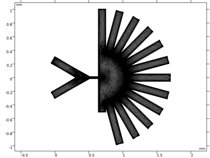 این هندسه شامل دو ورودی به عرض 0.1 میلی متر و طول 0.5 میلی متر است که با زاویه 45 درجه با یکدیگر ذوب شده اند . ورودی ها به یک میکروکانال با عرض 20  میکرومتر و طول 120  میکرومتر همگرا می شوند . میکروکانال به یک دهانه بازتر باز می شود که به دوازده خروجی و یک تخلیه تقسیم می شود. فاصله هر خروجی از نقطه وسط دهانه میکروکانال 1 میلی متر و فاصله تا خروجی تخلیه 0.5 میلی متر است. ابعاد ورودی، میکروکانال، خروجی و زهکشی و تعداد خروجی ها را می توان با ویرایش پارامترهای هندسی مناسب تغییر داد.