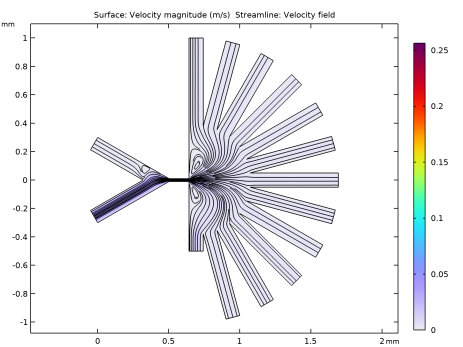 جریان نامتقارن سیال در خروجی تخلیه با استفاده از ویژگی Outlet در رابط جریان لایه ای به راحتی ضبط می شود. یک شرط مرزی فشار گیج صفر به هر خروجی اعمال می شود. افت فشار در امتداد کانال تخلیه به دلیل طول کوچکتر آن سریعتر است که منجر به سرعت جریان بالاتر در مقایسه با سایر شاخه ها می شود.