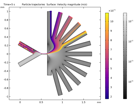 هنگام بزرگنمایی بسیار نزدیک به انتهای میکروکانال، به ویژه انتهای سمت راست، ممکن است برخی از مسیرهای ذرات به جای خروج از انتهای میکروکانال، از دیواره های کانال عبور کنند. این فقط یک مصنوع از روشی است که خطوط در نمودارهای مسیر ذرات با درون یابی بین تعداد گسسته دفعات خروجی نمایش داده می شوند. اگر تعداد دفعات خروجی به میزان قابل توجهی افزایش یابد، به نظر می رسد که ذرات به طور معمول از کانال خارج می شوند، اما اندازه فایل بسیار بزرگتر خواهد بود.