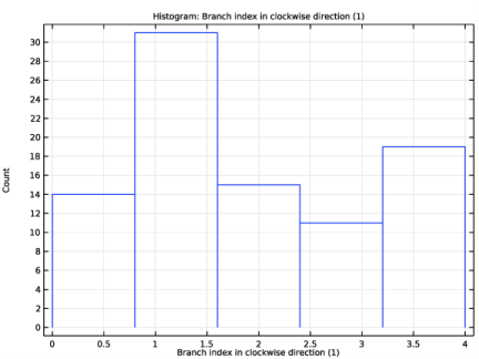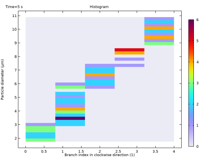 شکل 5 یک هیستوگرام است که تعداد ذرات خروجی از هر خروجی را نشان می دهد. در این شبیه سازی، ذرات از 5 شاخه خروجی اول خارج می شوند. علاوه بر این، شکل 6 یک هیستوگرام دو بعدی است که اندازه ذرات خروجی از هر خروجی را نشان می دهد.